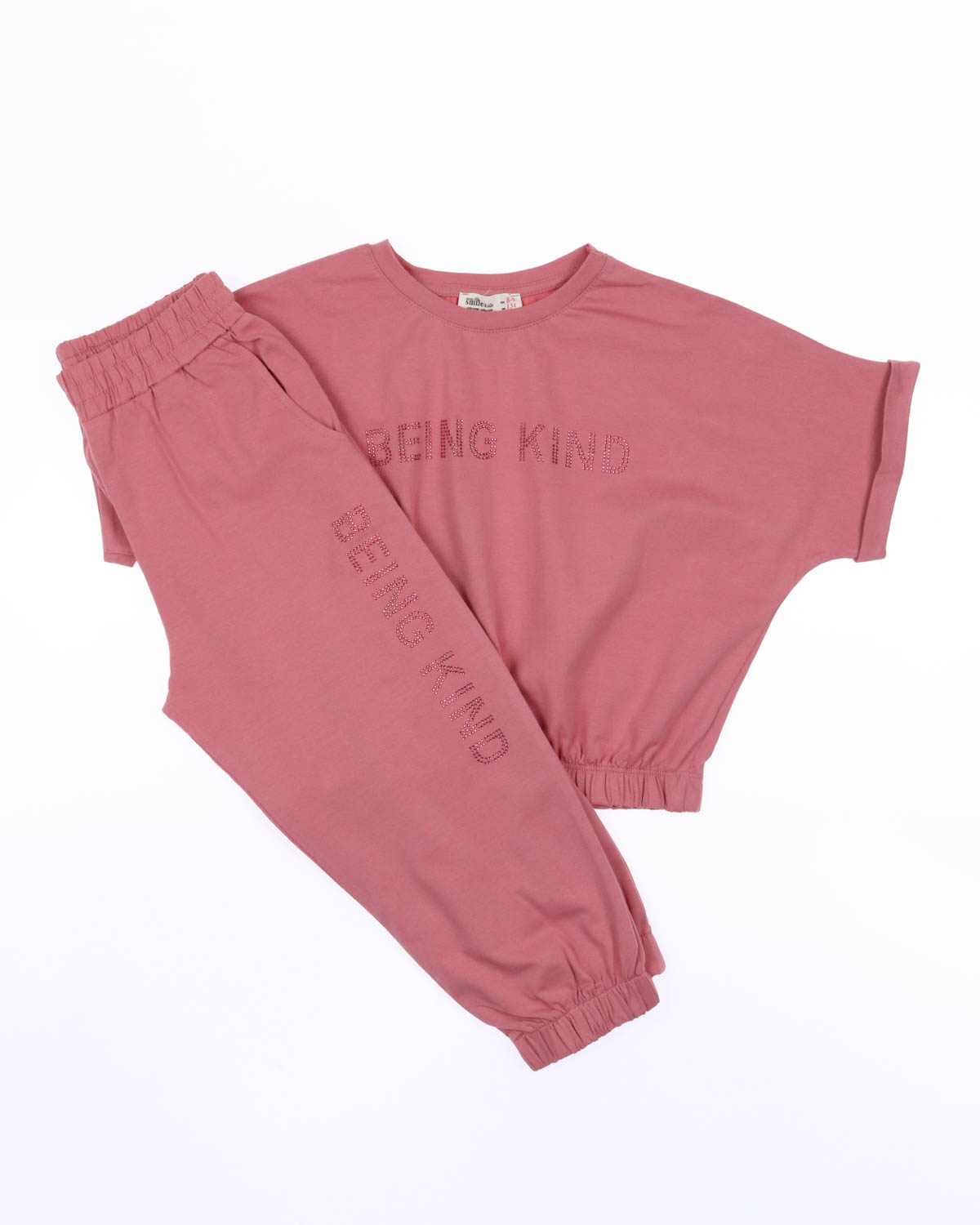 Укороченная футболка на резинке и брюки делают летний комплект оригинальным и стильным. Футболка и брюки декорированы аппликацией из страз.Брюки с боковыми карманами на мажетах. Костюм выполнен из мягкого трикотажа кулирка.