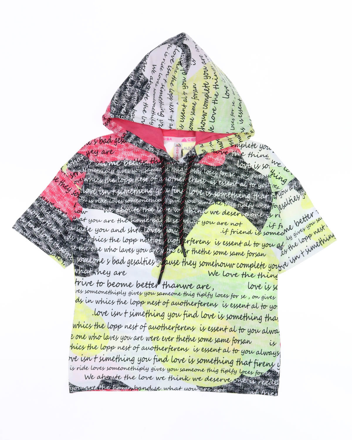 Летний костюм Cegisa для девочки оптом. Футболка с короткими рукавами, украшеная принтом и дополнена капюшоном со шнурком. Однотонные велосипедки облегающего кроя с поясом на резинке. Костюм изготовлен из хлопка с добавлением лайкры.