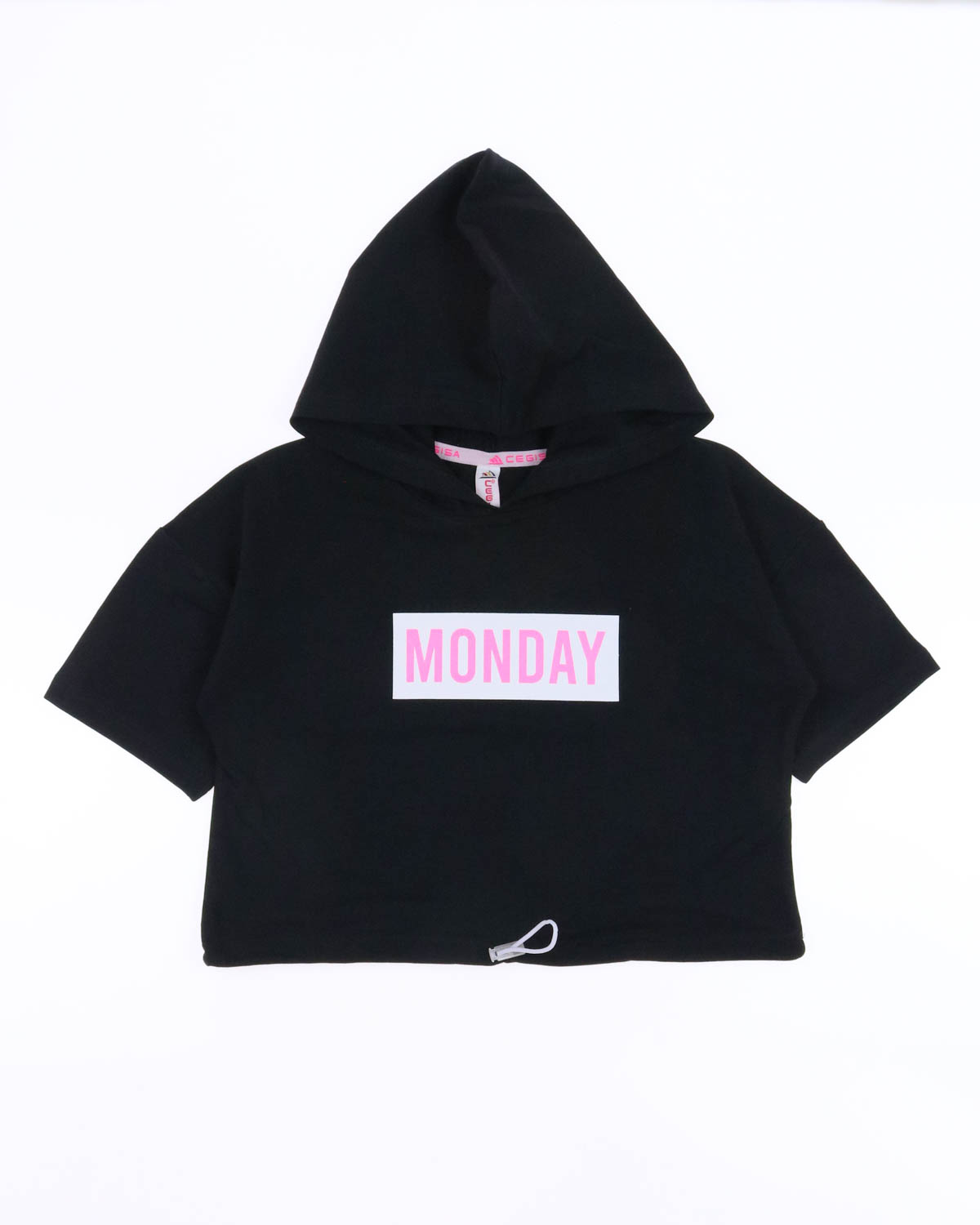 Летний костюм для девочек с принтом MONDAY. Кофта со спущенными короткими рукавами, дополненая капюшоном, низ на шнурке и трендовые велосипедки. Изготовлен из хлопка с добавлением лайкры.