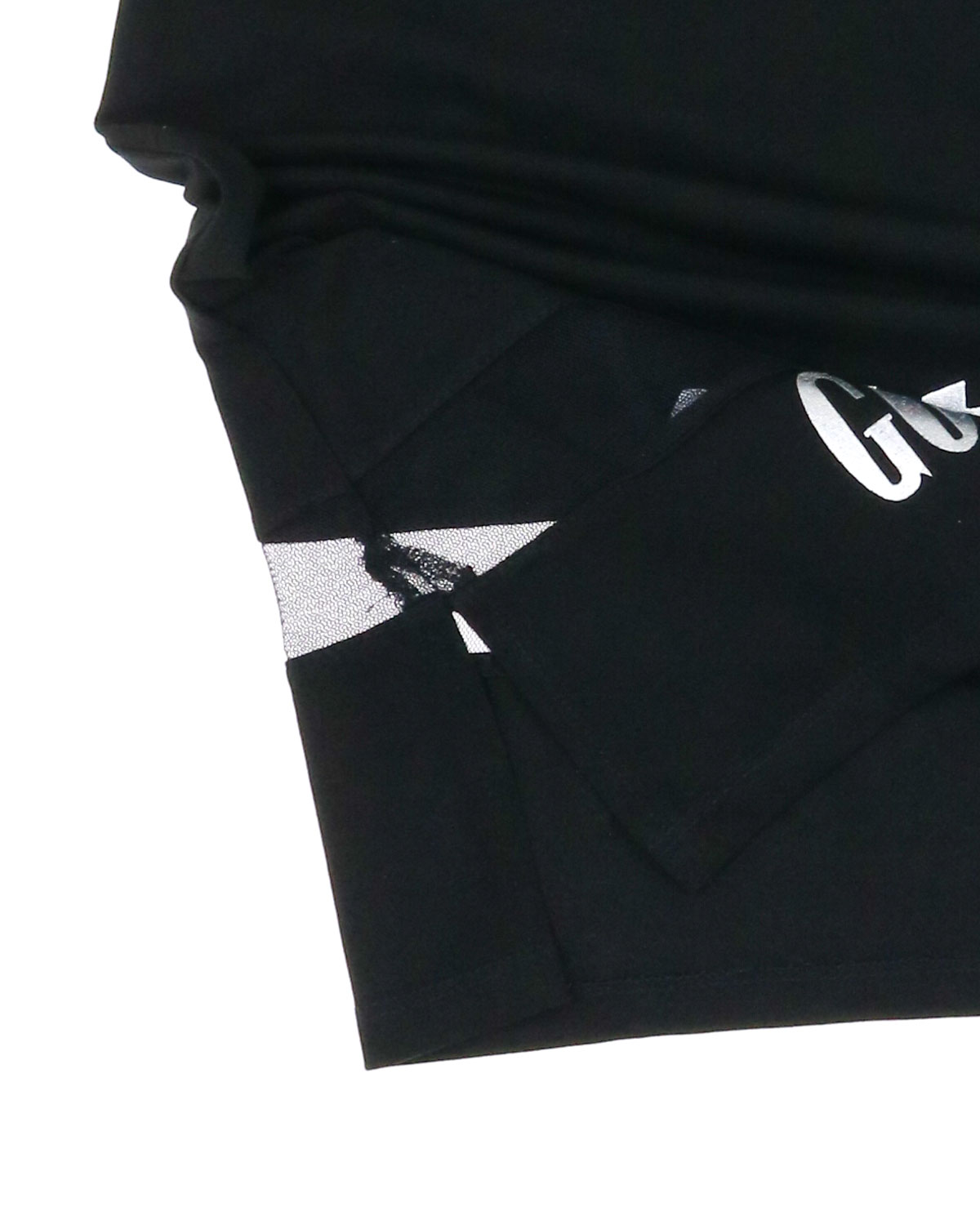 Платье выполнено из смесового трикотажа классического черного цвета. Платье приталенного силуэта низ оформлен вставками из сетки. По боковым швам небольшие разрезы.