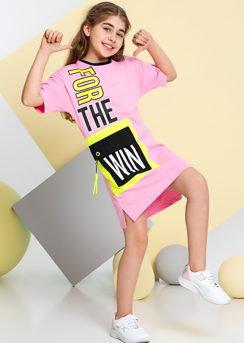 Стильное, необычное, очень комфортное для девочки, платье выглядит потрясающе. Оригинальный дизайн, построенный на модной форме и контрасте шрифтовой графики принта, подчеркивает остроту и оригинальность модели. Разрезы по бокам способствуют свободе движений девочки. Платье имеет модную длину до колена.