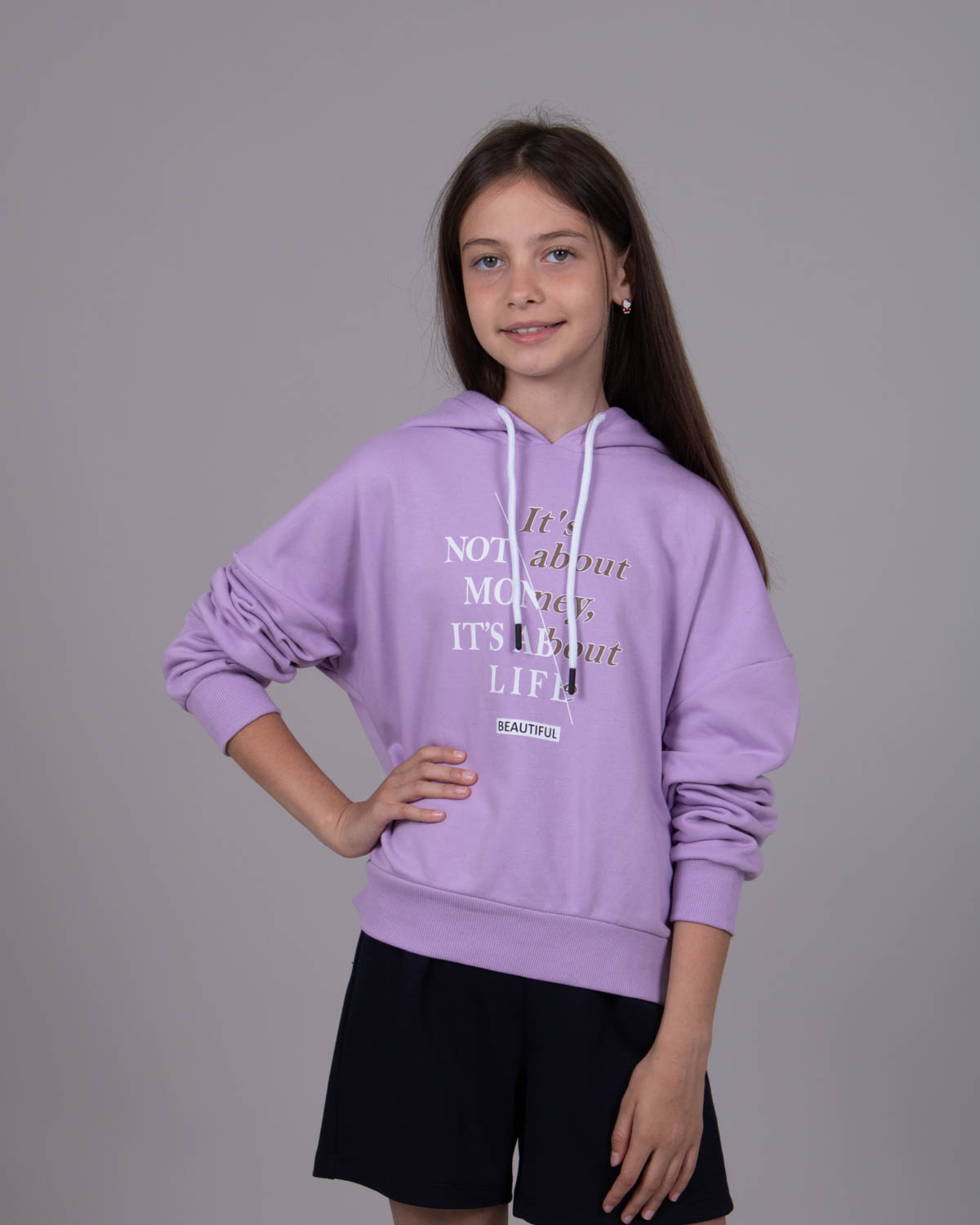 Худи для девочки выполнено из трикотажа - футер (петля). Модель дополнена аппликацией в виде игрушечного медведя.
