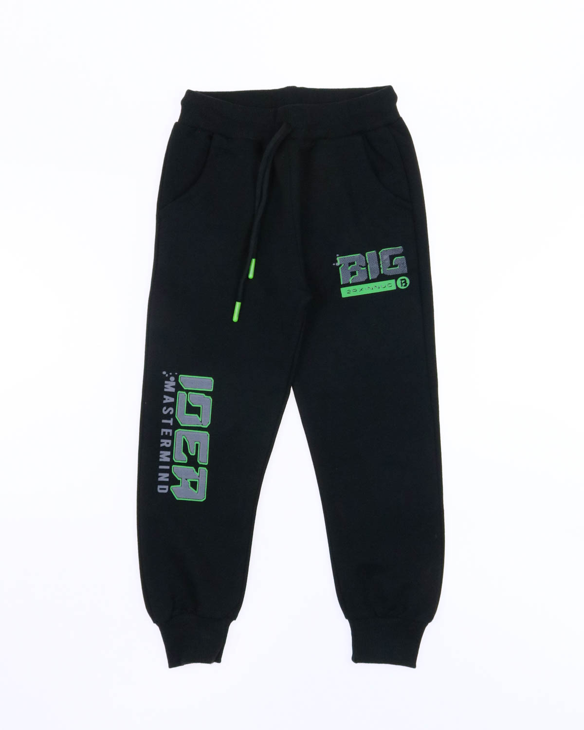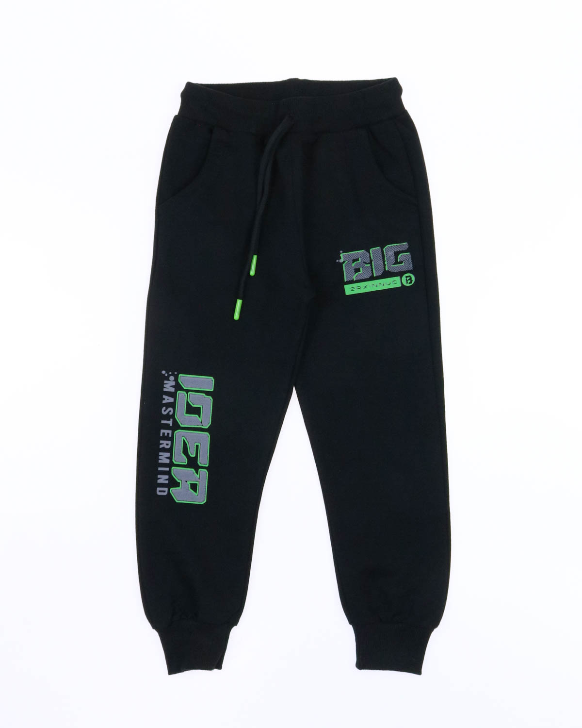 Однотонные брюки из трикотажа для мальчика, прямого силуэта, на притачном поясе с эластичной тесьмой и регулируемым шнуром спереди. Два боковых кармана, по низу брюк цельнокроеные манжеты.