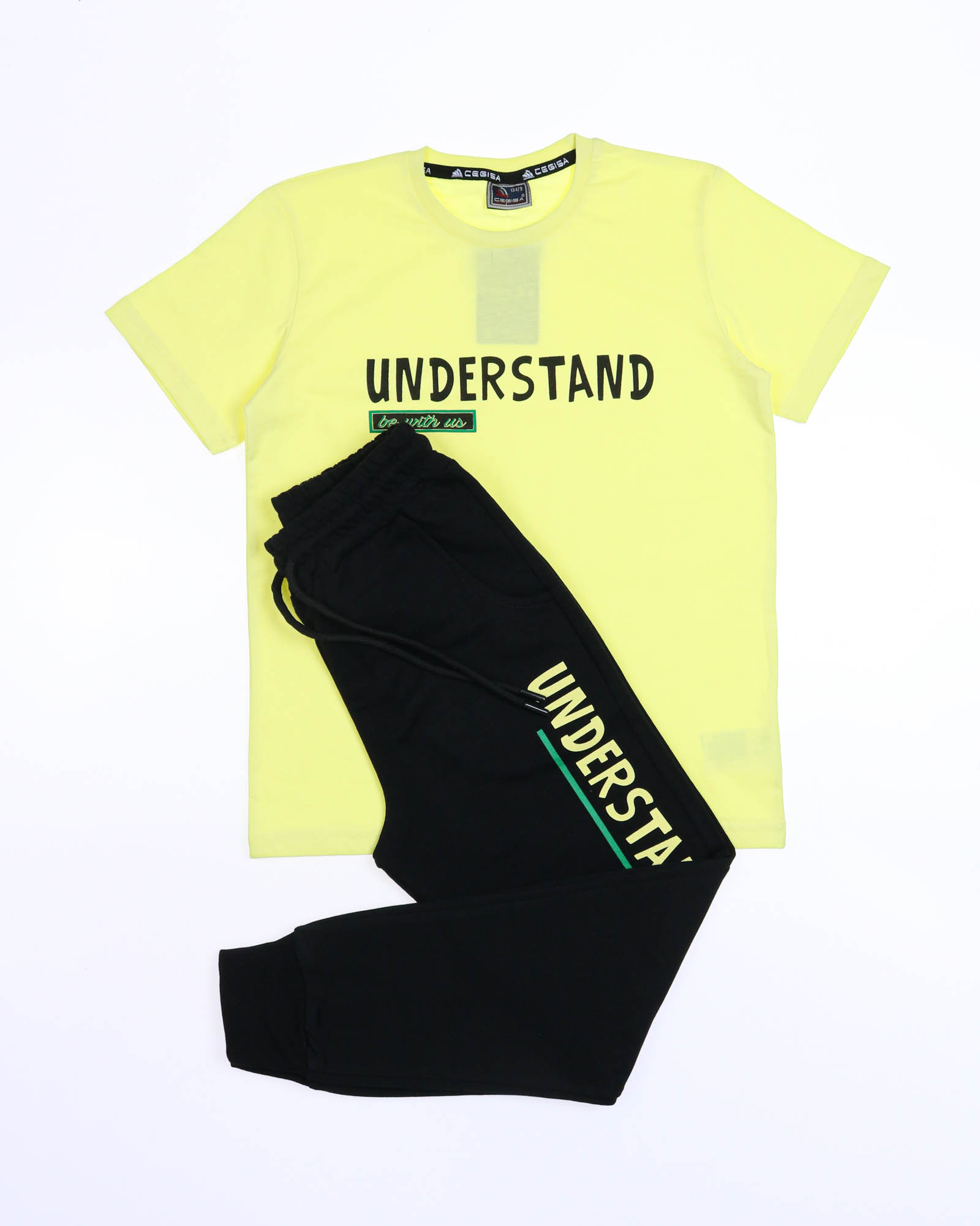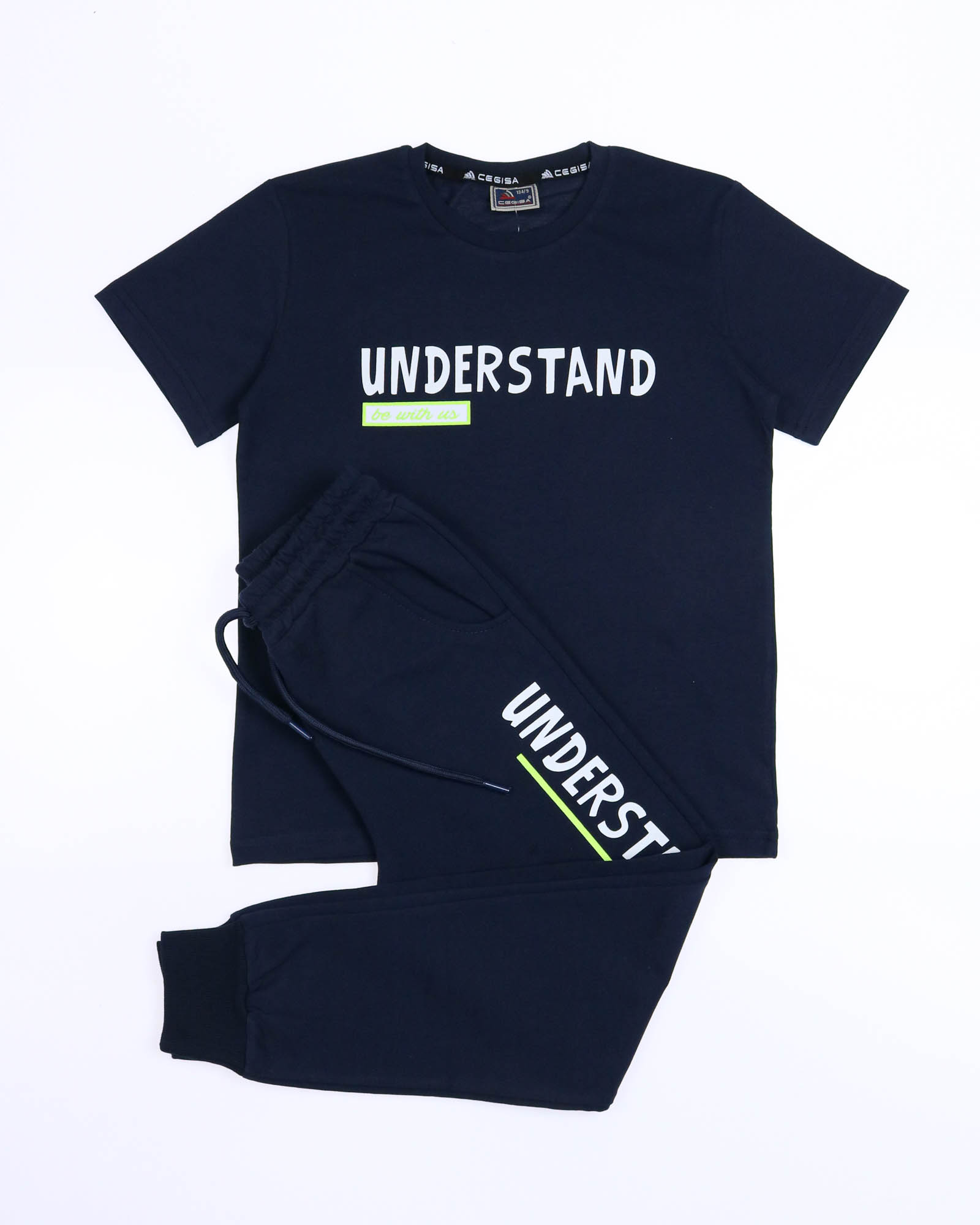 Трикотажный костюм CEGISA из хлопка оптом. Брюки выполнены из футера 2х нитки (петля) с карманами, на эластичном поясе с регулируемым шнурком и оригинальным принтом. Футболка выполнена из кулирной глади,прямого кроя с округлой горловиной, на груди стильный принт.
