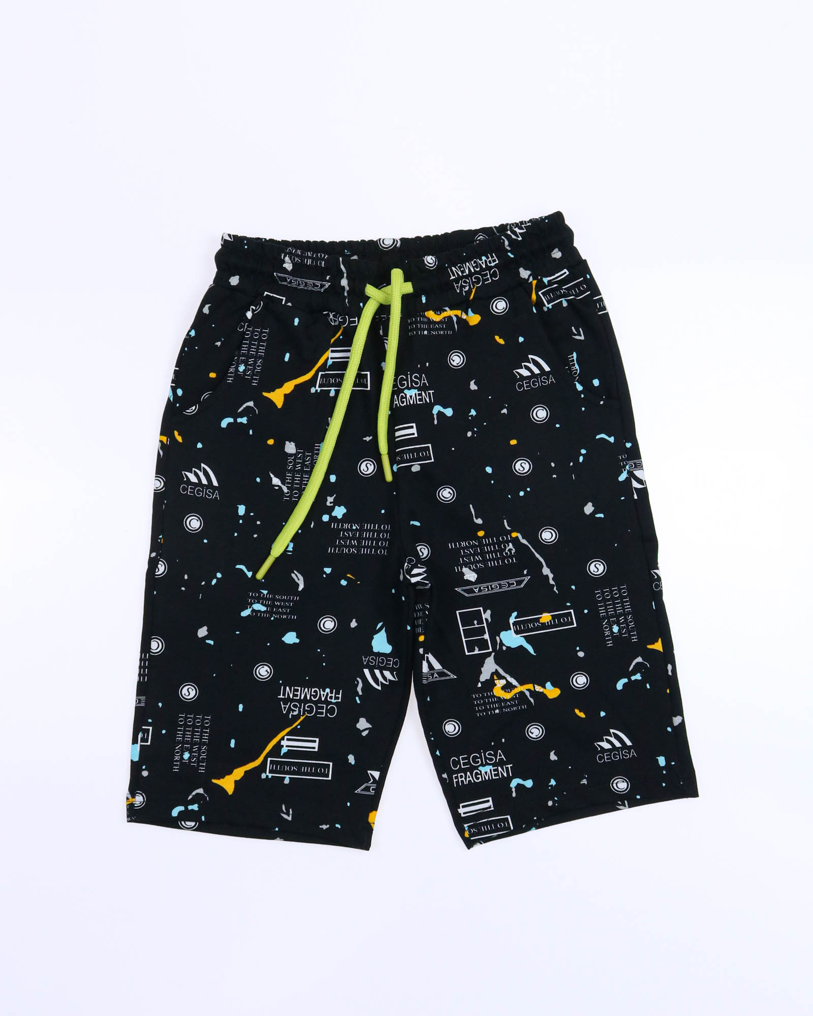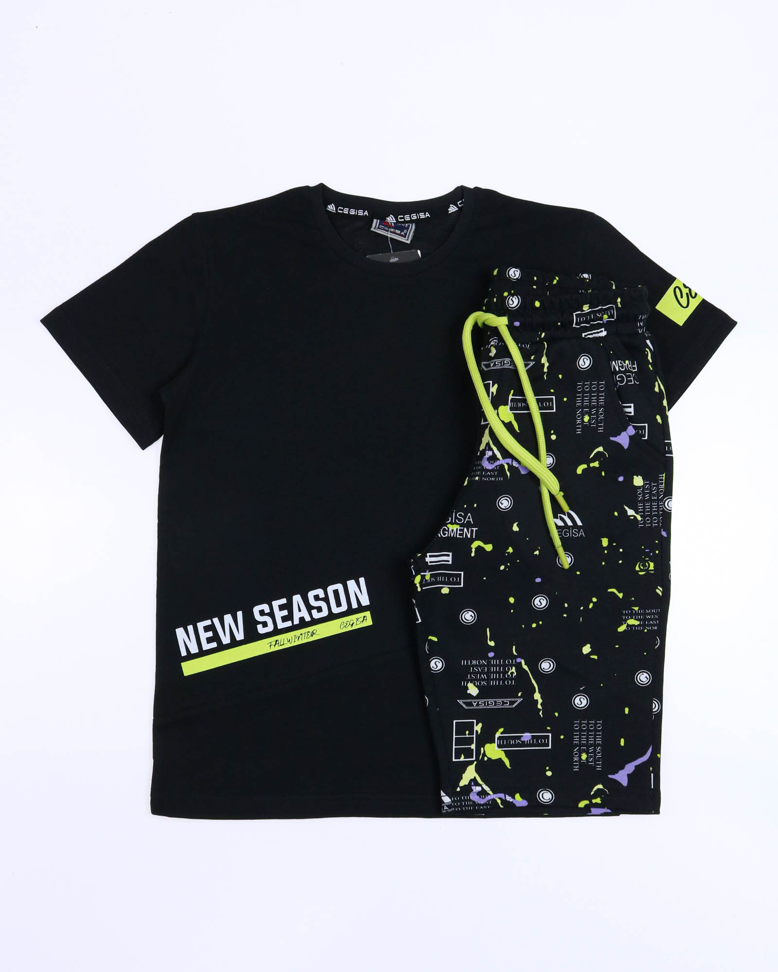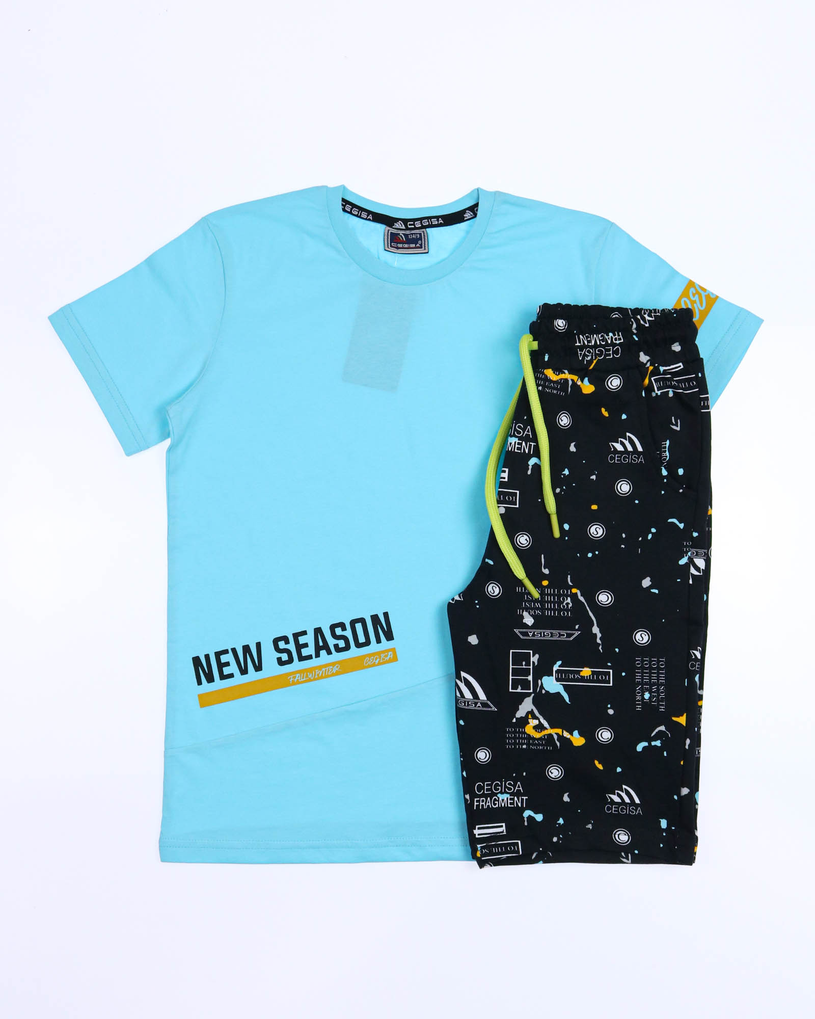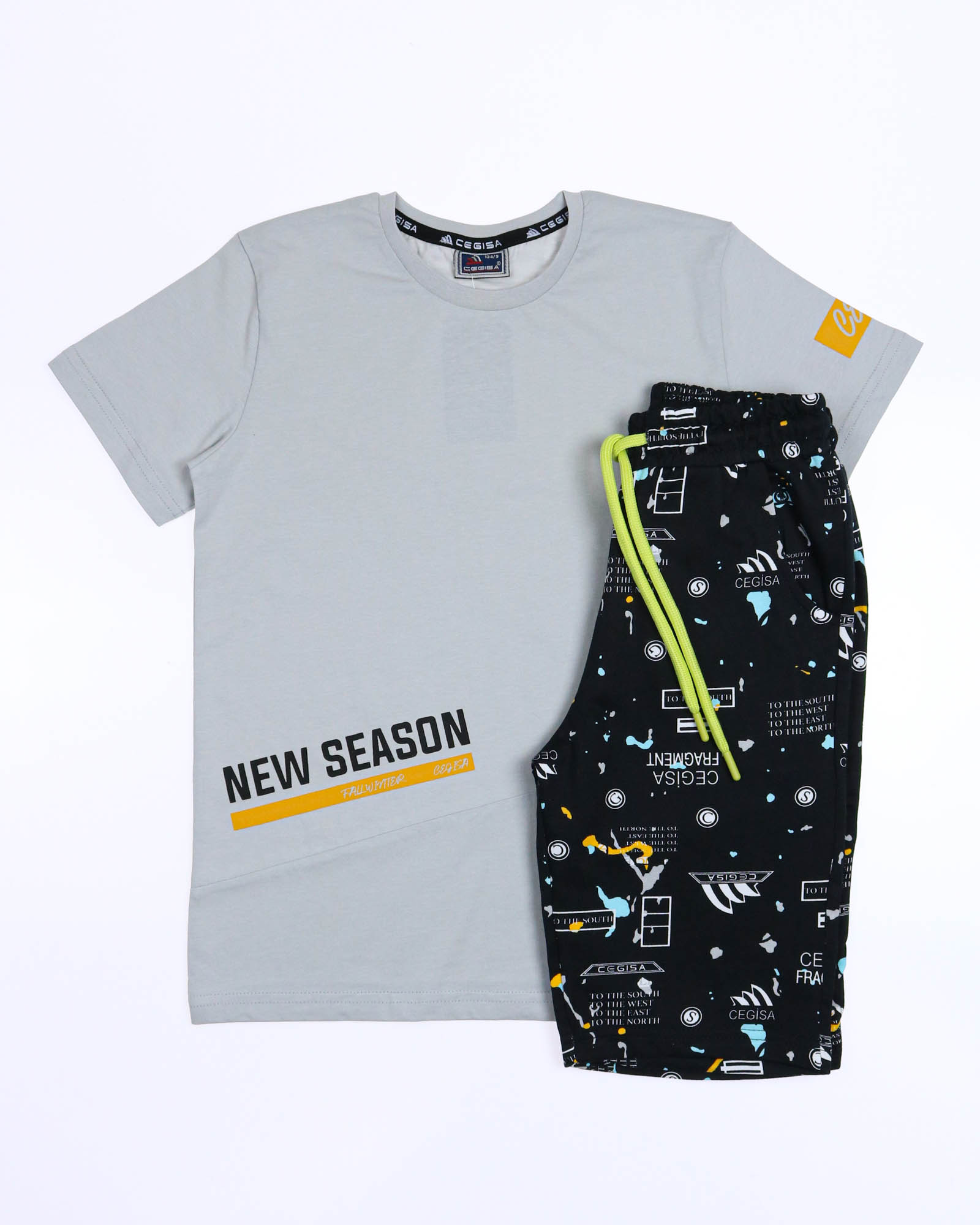 Трикотажный костюм CEGISA из хлопка оптом. Бриджи выполнены из футера 2х нитки (петля) с карманами, на эластичном поясе с регулируемым шнурком и оригинальным принтом. Футболка выполнена из кулирной глади, прямого кроя с округлой горловиной.