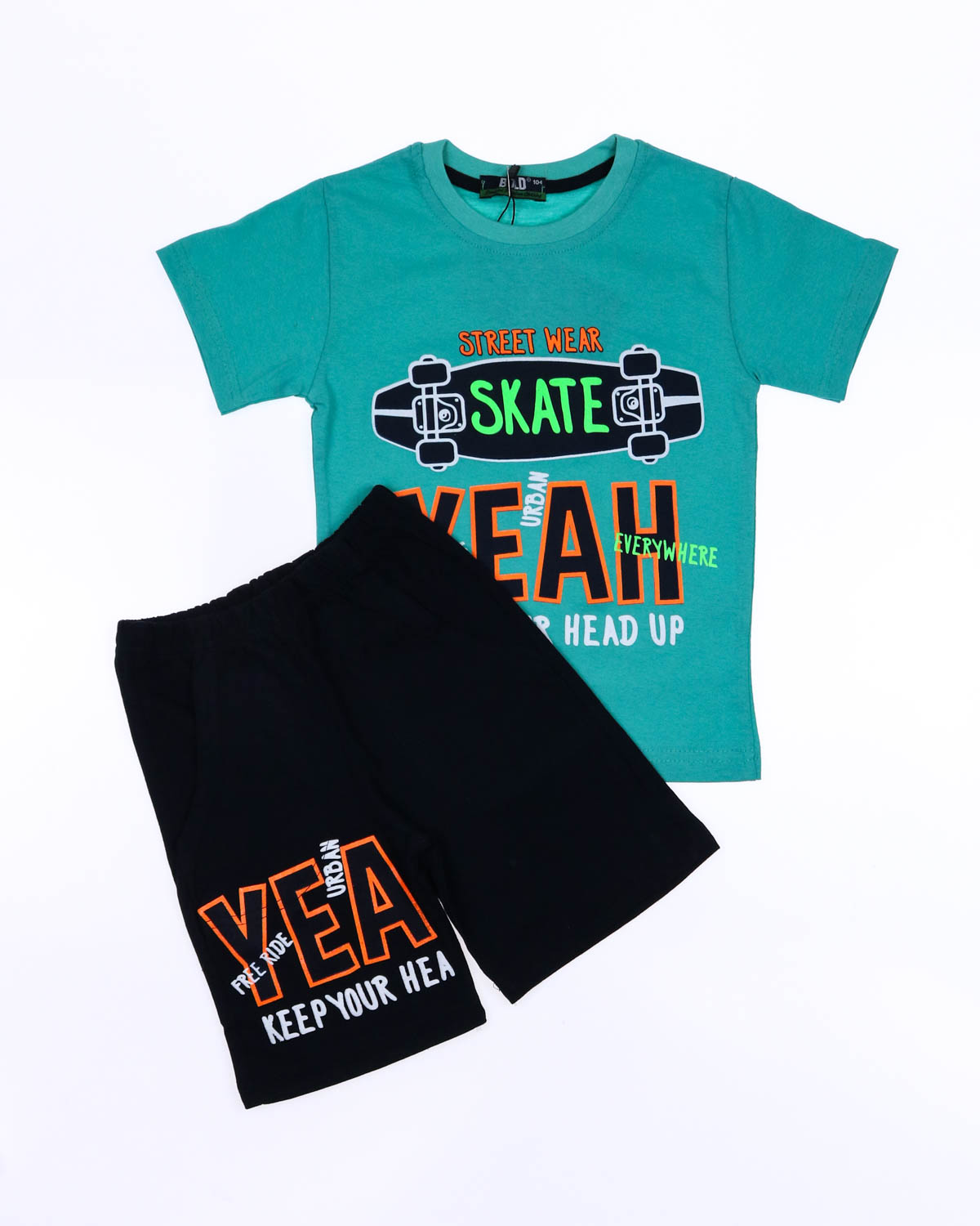 Трикожный костюм BOLD оптом из 100% хлопка с оригинальным, ярким принтом. Шорты трикотажные с карманами.