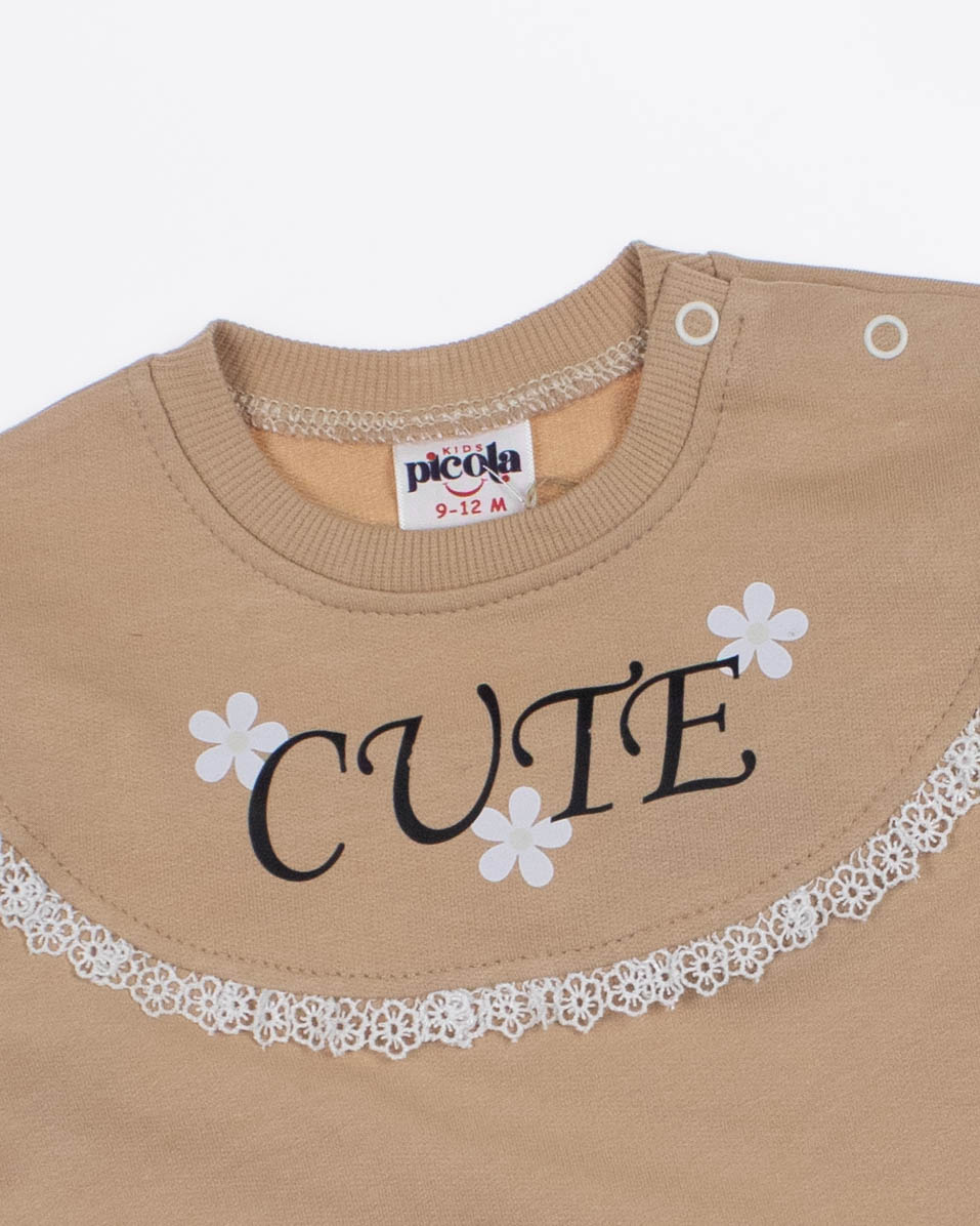 Мы предлагаем оптовые продажи детской одежды производства Турция. Хлопковый костюм PICOLA  выполнен из 100% хлопка, что гарантирует комфорт и безопасность для самых маленьких детей. Свитшот имеет удобную застежку-кнопки на плече, что облегчит процесс надевания и снятия одежды. Штанишки с мягкими манжетами на эластичном поясе идеально подходят для ношения с подгузником, обеспечивая свободу движений и комфорт. Детский милый принт на костюме поможет развить фантазию и воображение ребенка, делая его образ ярким и запоминающимся. Костюм PICOLA - отличный выбор для маленьких модниц и их заботливых родителей. Не упустите возможность приобрести этот уникальный товар оптом по выгодной цене!