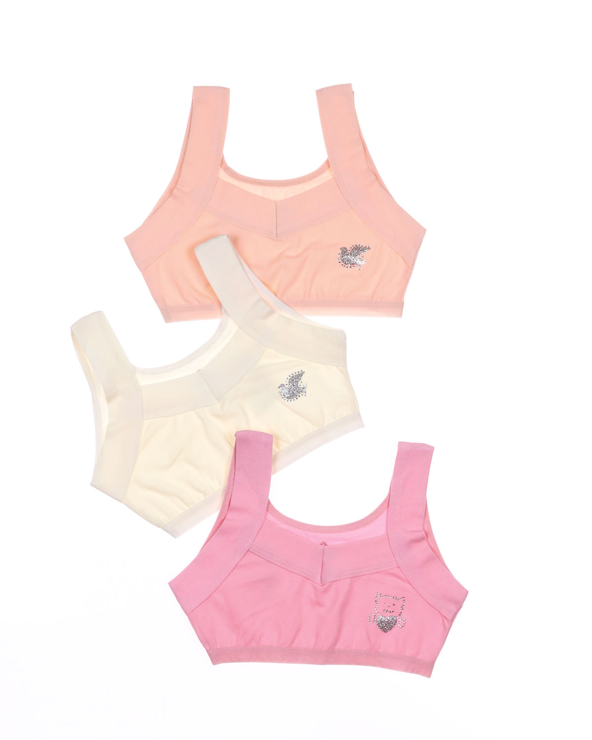 Бюстье для девочки изготовлено из кулирки гладкого, приятного к телу материала. Хорошо тянется благодаря добавлению эластана.   Бюстье для девочки очень комфортно для повседневной носки. Гипоаллергенная ткань приятно прилегает к телу, впитывая излишки влаги, пропуская воздух. Современная технология пошива обеспечивает изделиям высокие качественные характеристики и идеальный комфорт. Очаровательный дизайн и милый блестящий принт смотрятся невероятно нежно.
