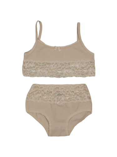 Этот ансамбль для юной леди от турецкой компании BAYKAR представляет собой образец сочетания удобства, функциональности и современного внешнего вида. Вещи созданы из высокосортного трикотажа на основе хлопка, в который вплетена износостойкая эластановая нить. Благодаря этому они неприхотливы в уходе, сохраняют свой цвет и форму даже после многократных стирок. Набор включает в себя топ и трусики, выполненные в бежевой гамме, которые декорированы нежным и эластичным кружевом.