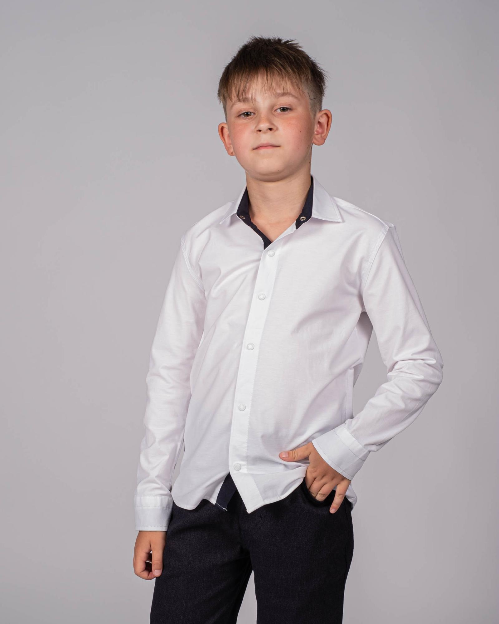 Элегантная рубашка приталенного кроя станет любимой вещью в гардеробе вашего юного модника. Длинные рукава и классический отложной воротничок делают модель универсальной — она уместна и в школе, и на празднике.